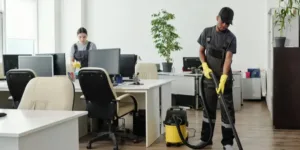 Expert Cleaning Specialists: Skilled staff using advanced tools and eco-friendly solutions for a spotless office.